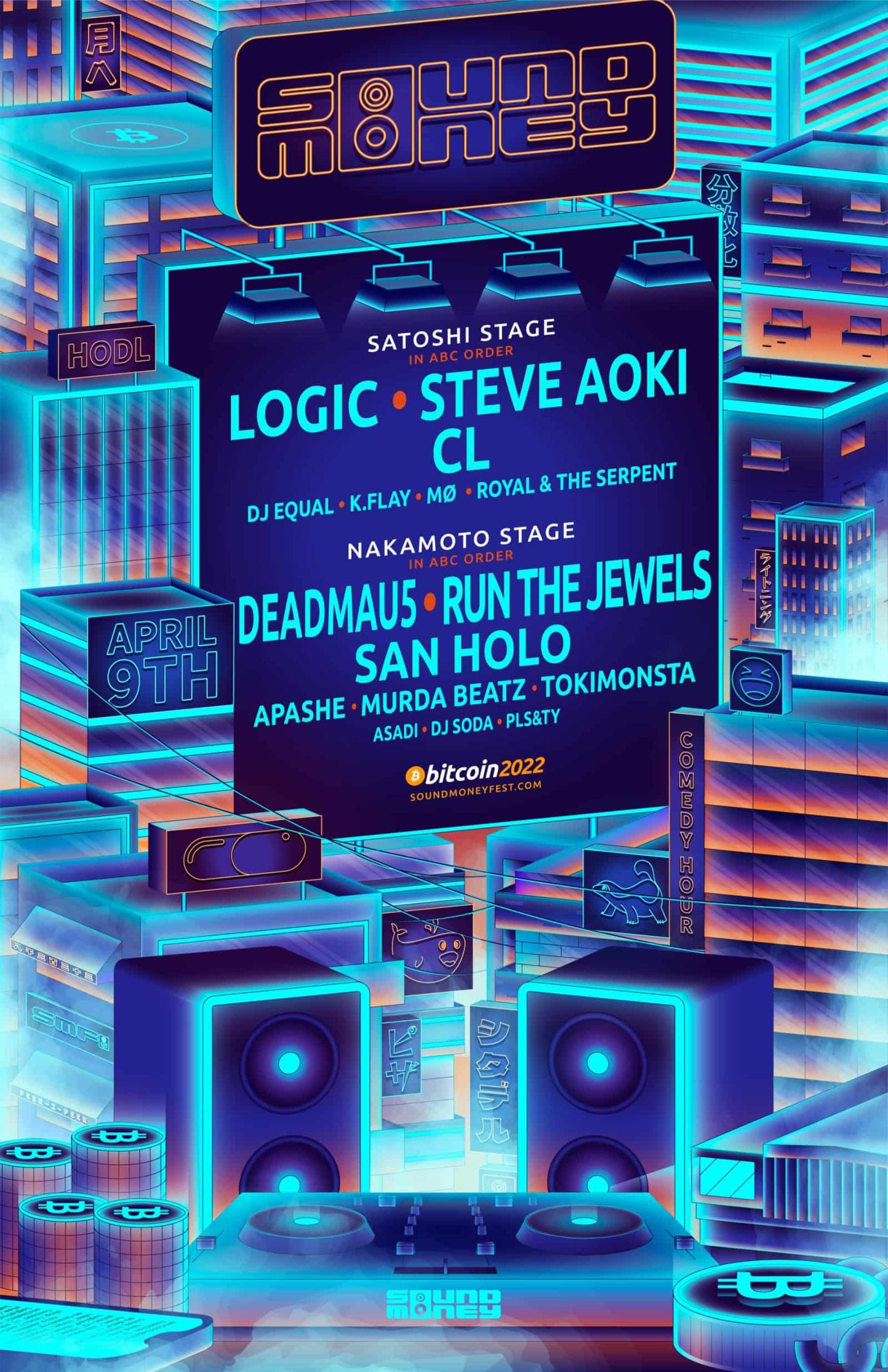 Sound Money Fest was a first of it's kind Bitcoin Music Festival founded by BTC Inc in 2022. The festival featured over 16+ leading artists including Deadmau5, Logic, Steve Aoki, and Run the Jewels. The inaugural event pulled in over 15k attendees across 3 main stages including a dedicated comedy room.